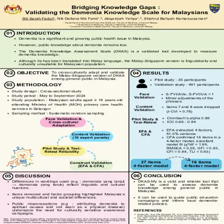 Abstrak: Demensia merupakan isu kesihatan awam yang ketara dan semakin meningkat di Malaysia. Walau bagaimanapun, pengetahuan awam tentang demensia masih rendah. Skala Penilaian Pengetahuan Demensia (DKAS) merupakan alat yang telah disahkan yang dibangunkan untuk mengukur pengetahuan demensia. Walaupun telah diterjemahkan ke dalam bahasa Melayu, versi Melayu-Singapura tidak sesuai dari segi linguistik dan budaya untuk penduduk Malaysia. Objektif kajian ini adalah untuk menyesuaikan dan mengesahkan versi DKAS Melayu-Singapura secara silang budaya dalam kalangan masyarakat umum di Malaysia. Kesimpulannya ialah DKAS-MY merupakan alat yang sah dan boleh dipercayai yang boleh digunakan untuk menilai pengetahuan demensia dalam kalangan masyarakat umum di Malaysia. Ia boleh digunakan untuk membimbing kempen pendidikan awam dan memaklumkan dasar berkaitan demensia tempatan.