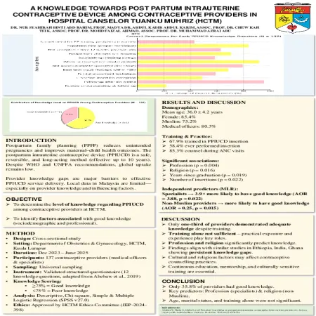 Abstrak: Perancangan keluarga selepas bersalin (PPFP) mengurangkan kehamilan yang tidak diingini dan meningkatkan hasil kesihatan ibu-anak. Alat kontraseptif intrauterin selepas bersalin (PPIUCD) adalah kaedah yang selamat, boleh diterbalikkan dan bertindak panjang (berkesan sehingga 10 tahun). Walaupun terdapat cadangan WHO dan UNFPA, penggunaan global masih rendah. Objektif kajian ini adalah untuk menentukan tahap pengetahuan mengenai PPIUCD dalam kalangan penyedia kontraseptif di HCTM dan untuk mengenal pasti faktor yang berkaitan dengan pengetahuan yang baik (Sosiodemografi dan profesional). Kesimpulannya hanya 35.8% penyedia mempunyai pengetahuan yang baik.