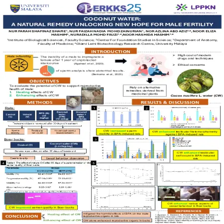 Abstrak: Kemandulan lelaki adalah ketidakupayaan lelaki untuk menghamilkan wanita selepas 1 tahun hubungan seks tanpa perlindungan. Ia memerlukan ubat dan teknik moden untuk menyembuhkan dan melibatkan etika. Kemudian bergantung pada remedi alternatif yang berasal dari tumbuhan ubatan. Objektif kajian ini adalah untuk menilai potensi air kelapa untuk menyokong kesihatan reproduktif lelaki bagi kesan penyembuhan air kelapa dan meningkatkan kesan air kelapa. Kesimpulannya, kesan penyembuhan air kelapa dapat mengurangkan kesan berbahaya BPA pada organ pembiakan lelaki pada tikus. Peningkatan kesan air kelapa sahaja adalah peningkatan organ pembiakan pada rusa jantan.