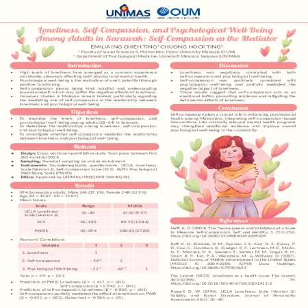 Abstrak: Tahap kesunyian yang tinggi telah muncul sebagai pengalaman biasa di seluruh dunia yang menjejaskan kesihatan fizikal dan mental secara negatif. Kesejahteraan psikologi adalah kesedaran potensi seseorang melalui fungsi positif. Belas kasihan kendiri bermaksud bersikap baik, prihatin, dan memahami diri sendiri, yang mungkin dapat menangkis kesan negatif kesunyian. Walau bagaimanapun, kajian di Malaysia masih terhad, terutamanya mengenai peranan mediasi belas kasihan kendiri dalam hubungan antara kesunyian dan kesejahteraan psikologi. Belas kasihan kendiri memainkan peranan penting dalam meningkatkan kesihatan psikososial dalam kalangan rakyat Malaysia. Mengintegrasikan intervensi berasaskan belas kasihan kendiri ke dalam program kesihatan mental yang berkaitan dengan budaya boleh menguatkan daya tahan emosi dan meningkatkan kesejahteraan psikologi keseluruhan dalam komuniti.